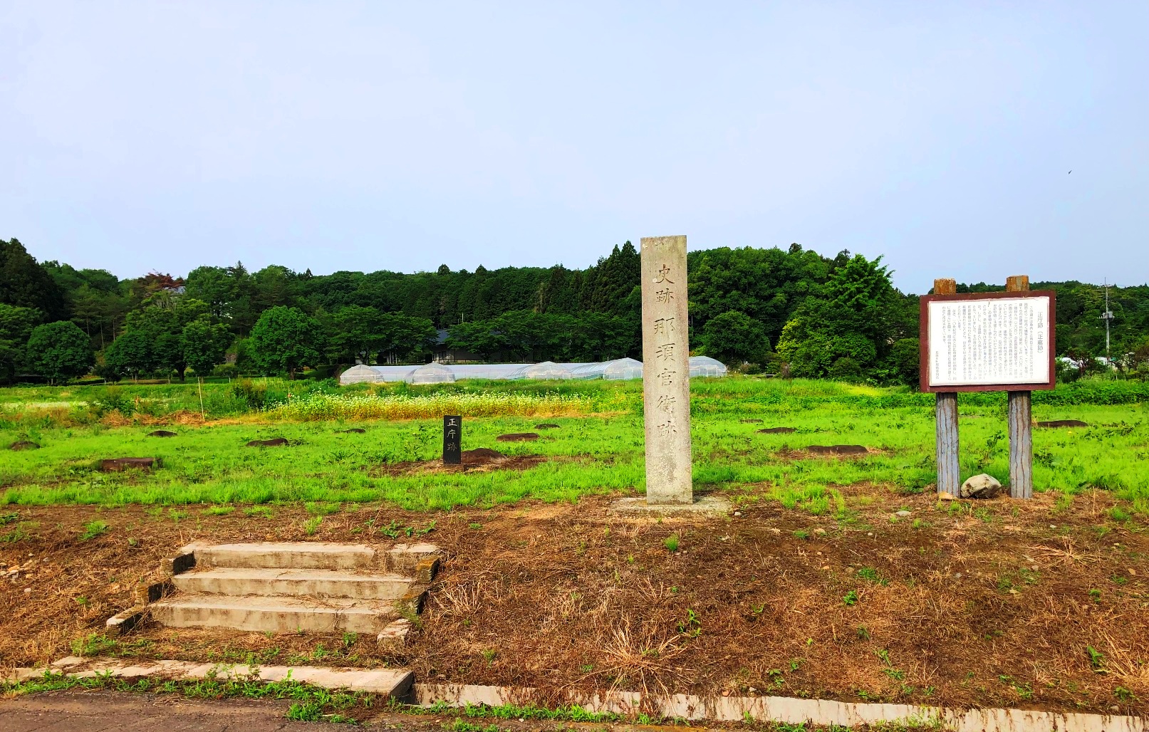 同じく那須郡衙近くに梅曽大塚古墳跡がある。郡衙に隣接していることから、郡司になった前述・那須直韋提の墓だった可能性が高い。水戸光圀は上下侍塚古墳が彼の墓かと思って発掘をしたわけだが、こちらが本命だったかも知れない。墳丘長50mまたは37mの前方後円墳。古墳の時代も終末期なので、この地の強固な前方後方墳文化も前方後円墳路線に転換したようだ。後期に特徴的な横穴式石室もあった。1964年に発掘調査が行われたが、1969年に水田化で残念ながら墳丘は失われた。