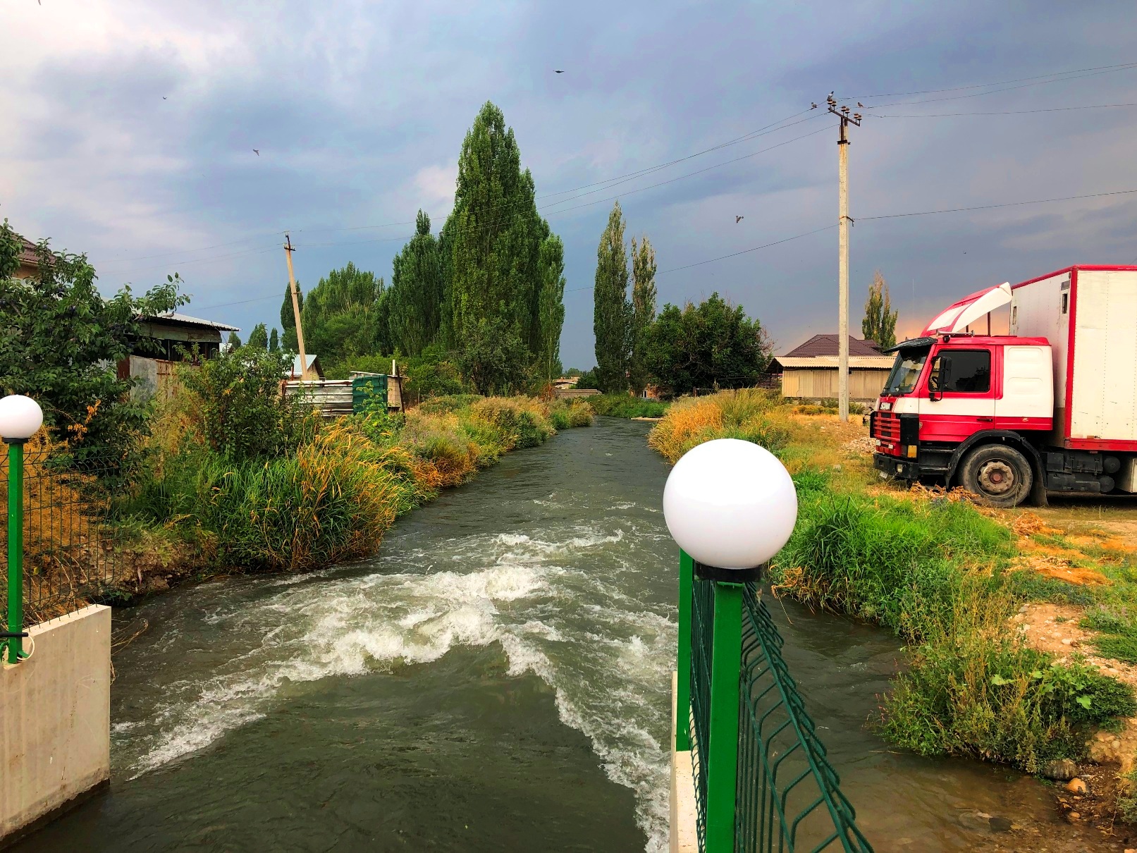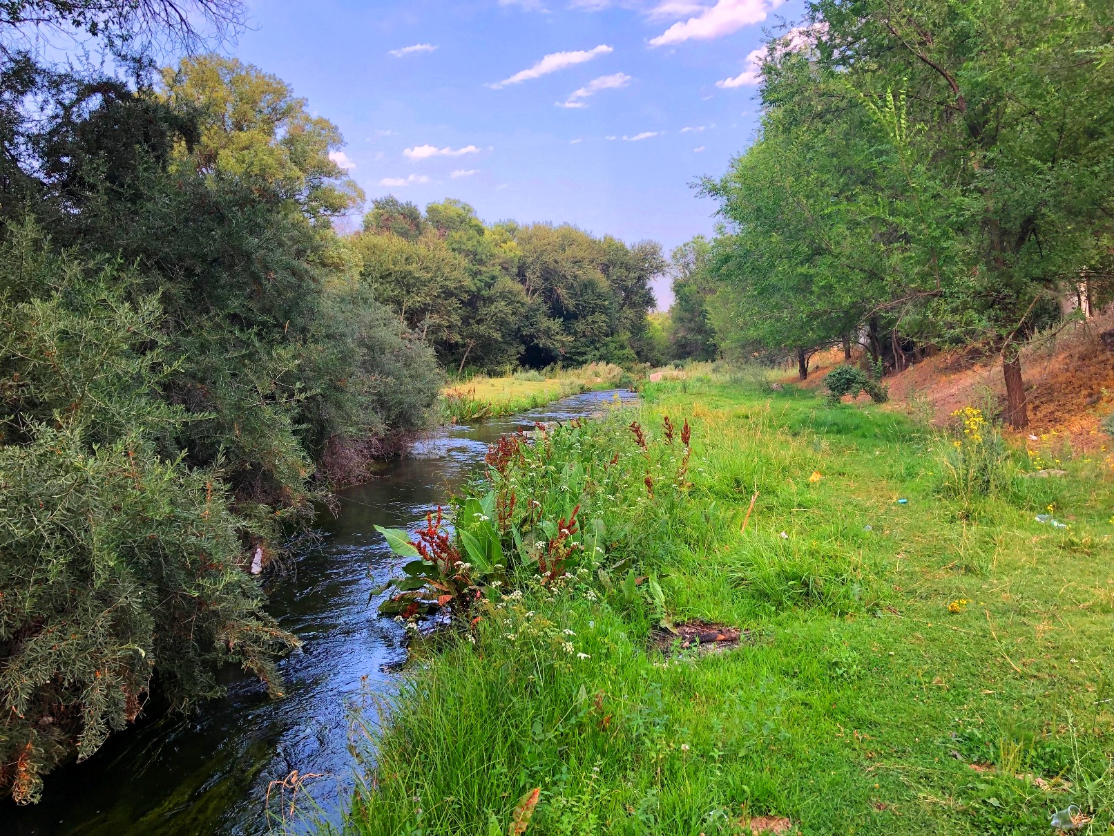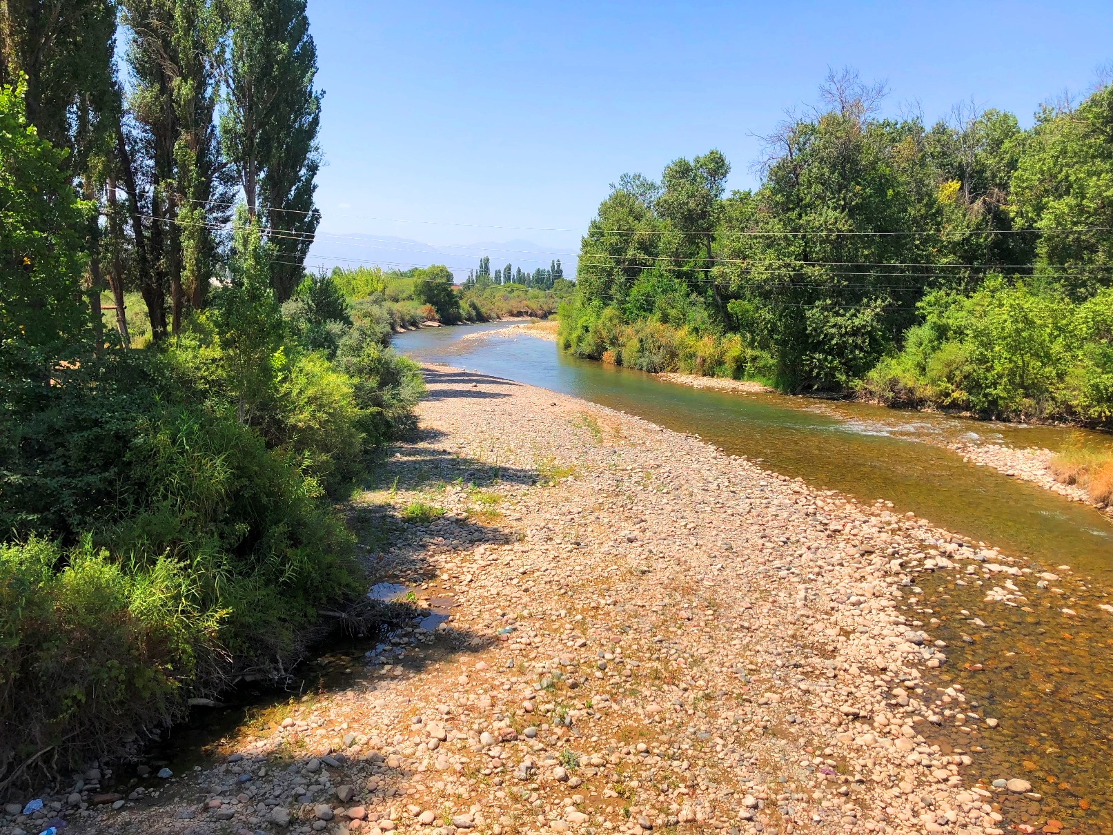 そして主要テーマのタラス川だ。川へのアクセスがつくられてはいない。川近くは民家だったり、壁に遮られていたり、深い藪で入れなかったりする。地図を見る限り、この川を眺められるのは、中心部から数キロ離れた道路橋からだけだ。自然のままに放置された川はこの辺では無数の支流に別れ、緑の藪の中を流れている。それがある程度まとまった「本流」になってこの橋のあたりで見事な姿を見せてくれる。