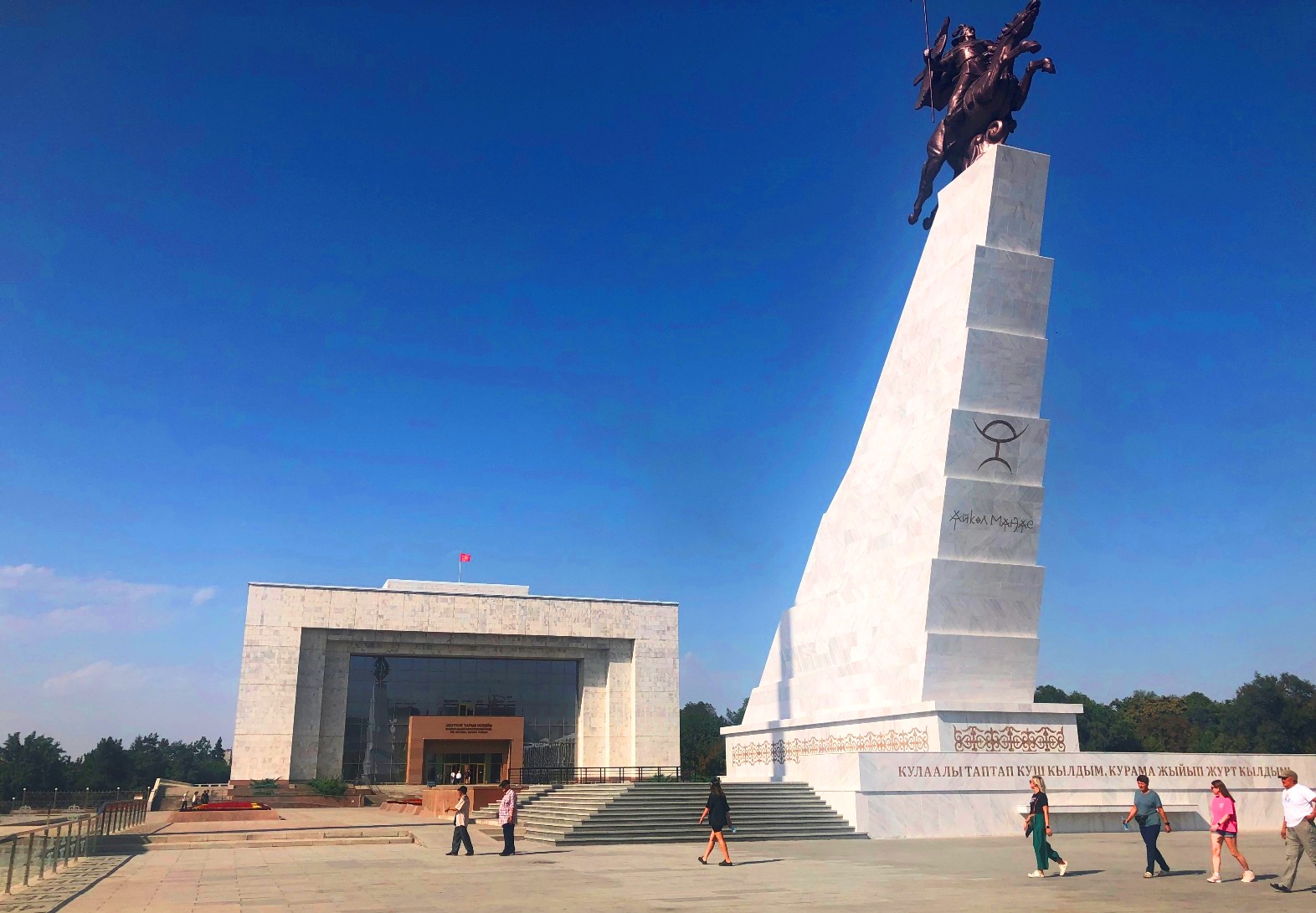 街の中心、アラトー・スクエア。博物館を背景に、民族の英雄マナスの巨大像が立てられている。かつてはここにレーニン像があった。