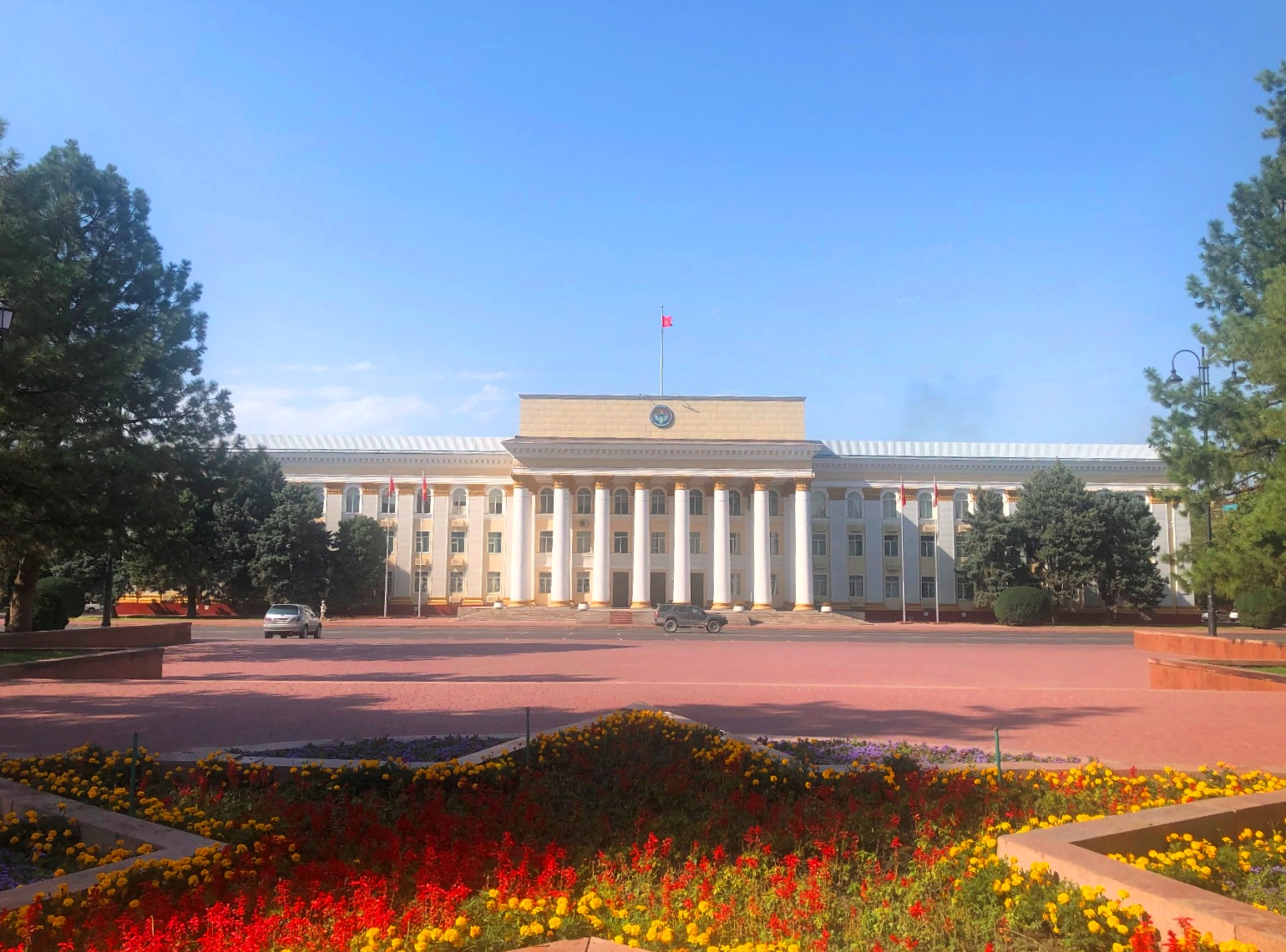 レーニン像の視線の先にキルギス政府庁舎ビルがある。ソ連時代の1936 年に建造。1957年以降は共和国最高評議会が置かれていた。