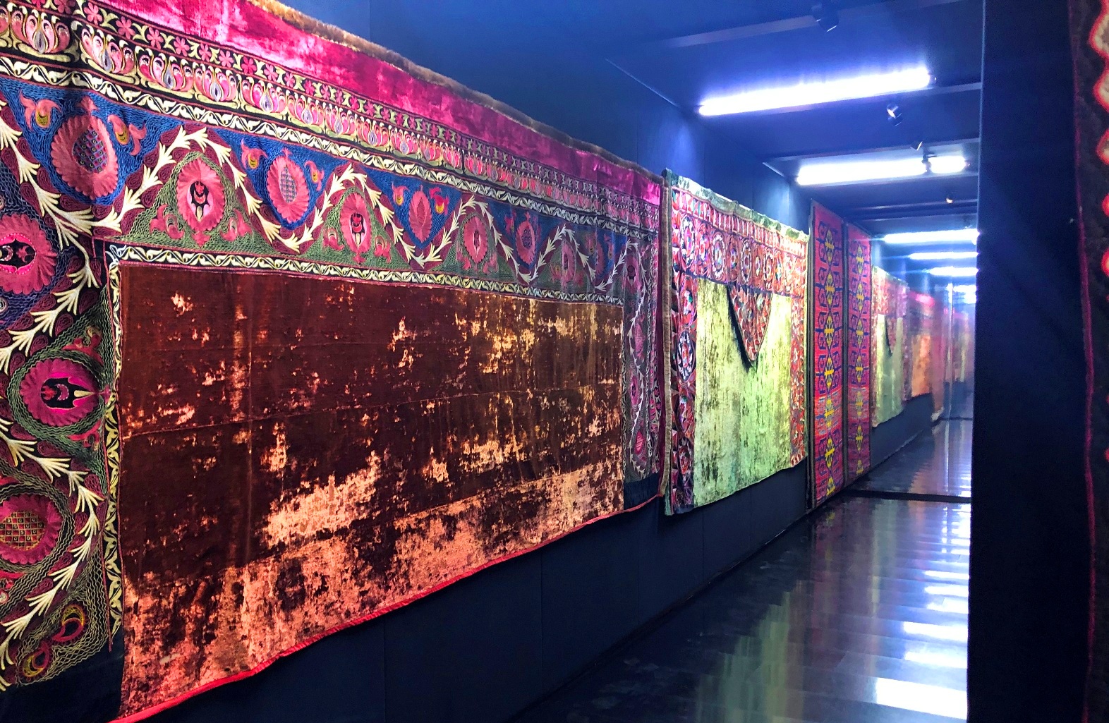遊牧民の生活からつくりだされた民芸品、絨毯の展示。