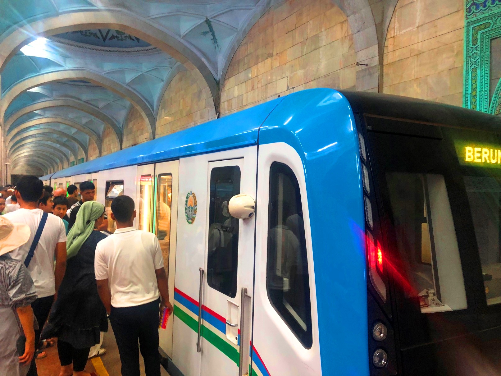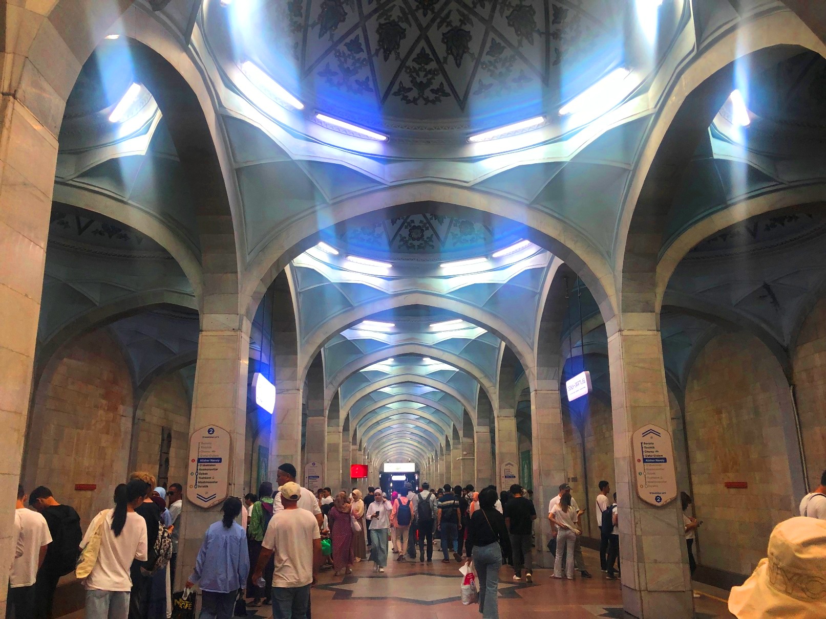 市民の足となっている地下鉄。タシケント地下鉄は、1977年に最初の路線が開業しており、中央アジアでは最も古い(旧ソ連の地下鉄としては7都市目)。現在、4路線50駅、総延長66.5 km。ソ連式地下鉄の特徴は駅の装飾が凝っていること。チョルス―・バザールに行くのも、ブルー線のチョルス―駅が最寄だ。