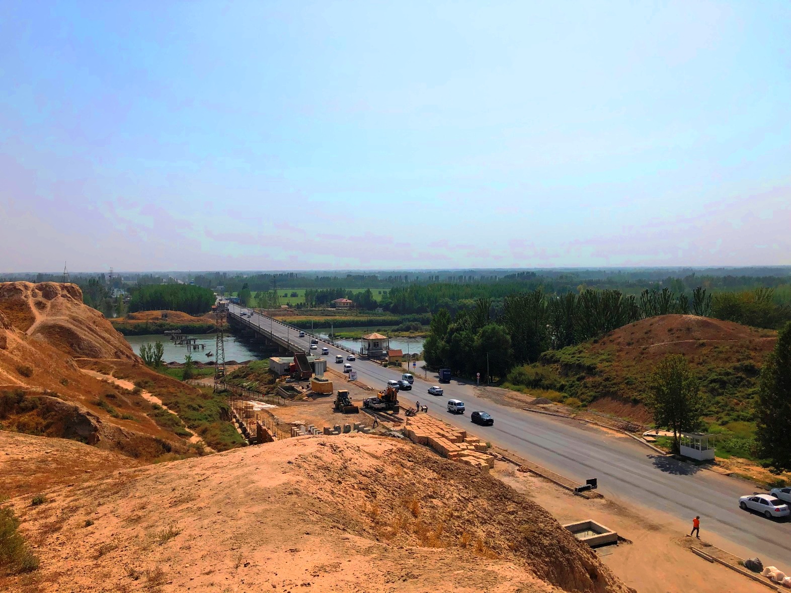 やむを得ず、遺跡正面に戻り、道路橋を渡りながらシルダリア川の写真を撮らせて頂いた。すると戻ってきた橋のたもとに検問所があり、そこから出てきた兵士に「写真はだめだ」と言われ、橋の上から撮った写真をすべて消されてしまった。残念だ。川の方から見て城址がいかに堅固な守りになっているかを知るのは、遺跡理解の上で大切なのだが。 橋の上から写真を撮って何かセキュリティに根本的な問題が生じるか。今の時代、橋の写真などネット上でいくらでも探せる。ウズベキスタンでは以前、タシケントの地下鉄を撮るのさえ禁止していた(今はOK。2018年に禁止解除)。管理が厳しすぎるのでは、とも思ったが、ここは民族衝突やイスラム過激派のテロが絶えないフェルガナ盆地だ。理解しなければならないかも知れない。古代フェルガナの記憶に触れて気分が高揚していたが、少し現実に戻された。