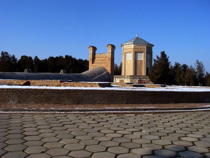 (ウルグベク天文台跡。アフラシャブの丘に隣接している。チムールの孫にあたるウルグベクは学者肌で天文学に秀でていた。1420年代にこの天文台を建設し、イスラム世界の天文学を発展させた。死後、天文台は破壊されたが、1908年に、高さ40メートルに及ぶ大型六分儀の地下部分(写真)が発見された。ウルグベクは1年を365日6時間10分8秒と計算したが、これは現代の測定値365日6時間9分9.6秒と58秒程度の誤差しかない。)