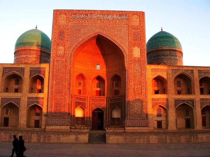 (ブハラは、旧市街全体が世界遺産に登録されており、モスクや僧院など街自体が博物館の趣き。サマルカンドと並び古代からソグディアナの主要都市として文化的発展を享受した。写真右(西)はブハラのシンボルとなっているカラーン・ミナレット。カラーンはタジク語で「大きい」という意味。高さ46メートルで街のどこからでも見える。1127年築。写真左(東)は神学校ミル・アラブ・メドレセ。)
