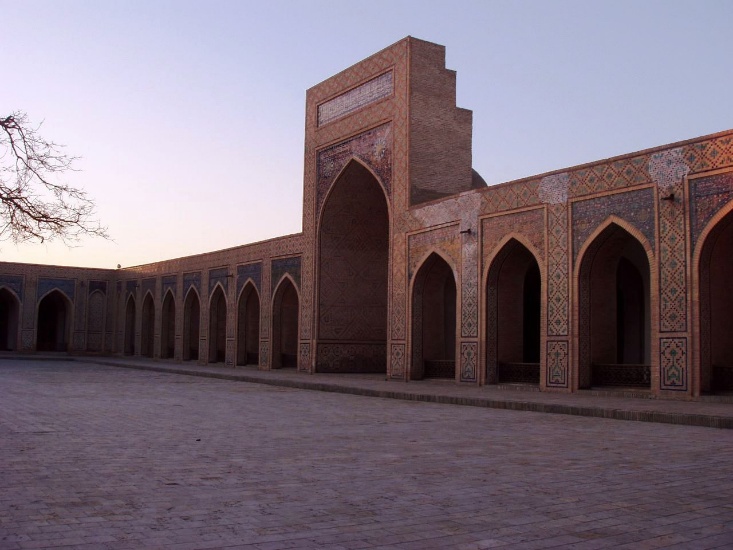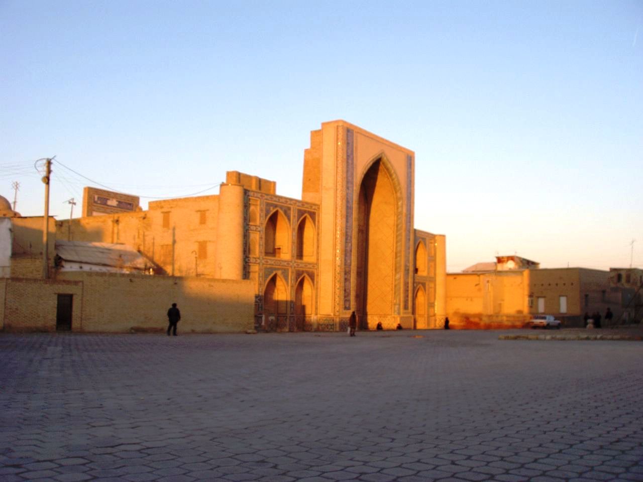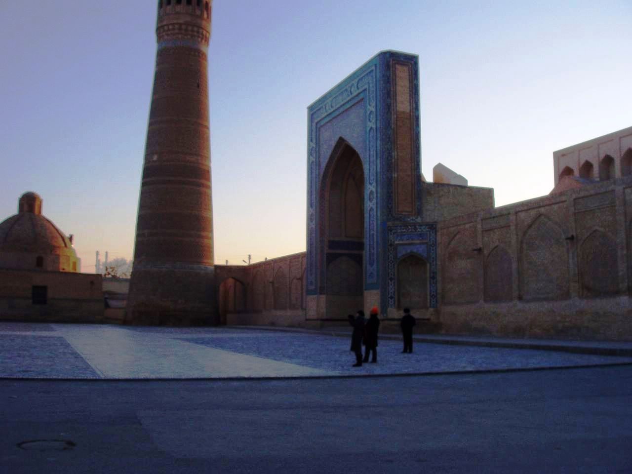 (ミナレットの右(西)にはカラーン・モスク。サマルカンドのビビハニム・モスクに匹敵する大きさ。モンゴル軍が宮殿と間違えて徹底的に破壊したという話もある。現在のものは1514年築。)