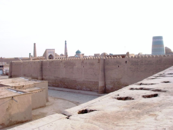 (城壁から、「古い宮殿」の向こうに未完成ミナレットのカルタ・ミナル(右)、イスラーム・ホジャ・メドレセのミナレット(左手中央、45メートル)、ジュマ・モスクのミナレット(左端、42メートル)が見える。)