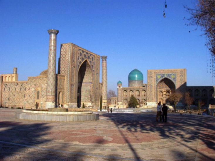(シルクロードの象徴、サマルカンドのレギスタン広場。サマルカンドは、紀元前10世紀頃よりイラン系のソグド人の都市国家として栄え、中央アジアの交易を支配した。1220年にモンゴルにより徹底的に破壊されたが、その後チムール帝国の首都として復興する。レギスタン広場はその復興したサマルカンドの中心的存在。三つの神学校が並ぶ広場だが、かつてバザールもおかれ各種行事の場としてにぎわった。)