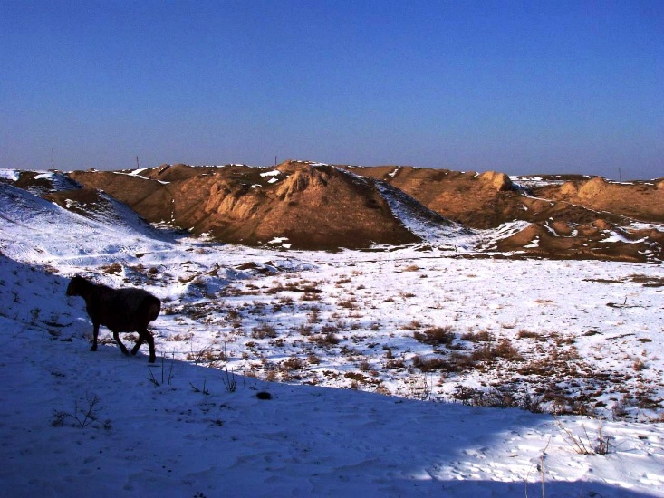 (現サマルカンドの北側に横たわるアフラシャブの丘。かつてはここにサマルカンドの街があったが、1220年にモンゴル軍に破壊された。住民の4分の3が殺されたという。以後、荒野となり、新しい街はすべて低地側につくられた。)