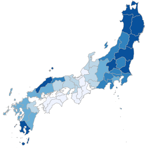 比較のため、現在の日本列島住民のDNA分析の比較地図を下記に掲げる。色が濃くなるほど縄文系の性格が強くなり、薄いほどそれ以外、つまり弥生から古墳時代にかけて大陸から入ってきた人々の系統が強いことを示す。上記二つの方言アクセント分布と奇妙に一致することがわかる。中央の京阪地域(と四国)に弥生・古墳系が多く、そこから離れるにつれて縄文系の系統が強くなることがわかる。