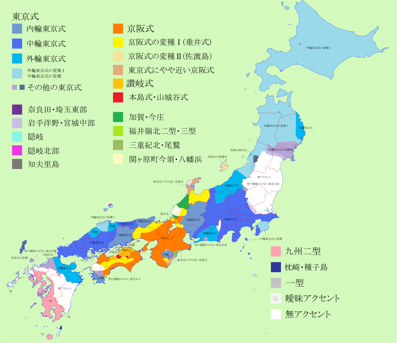 日本語方言のアクセントは、例えば東京式アクセントが内輪型、中輪型、外輪型に分かれるなどさらに細かく分かれている。その詳細を図示したのが下図だ。大まかに言って、ブルー系が東京式、暖色系が京阪式、白系が無アクセントなど単純アクセント系だ。