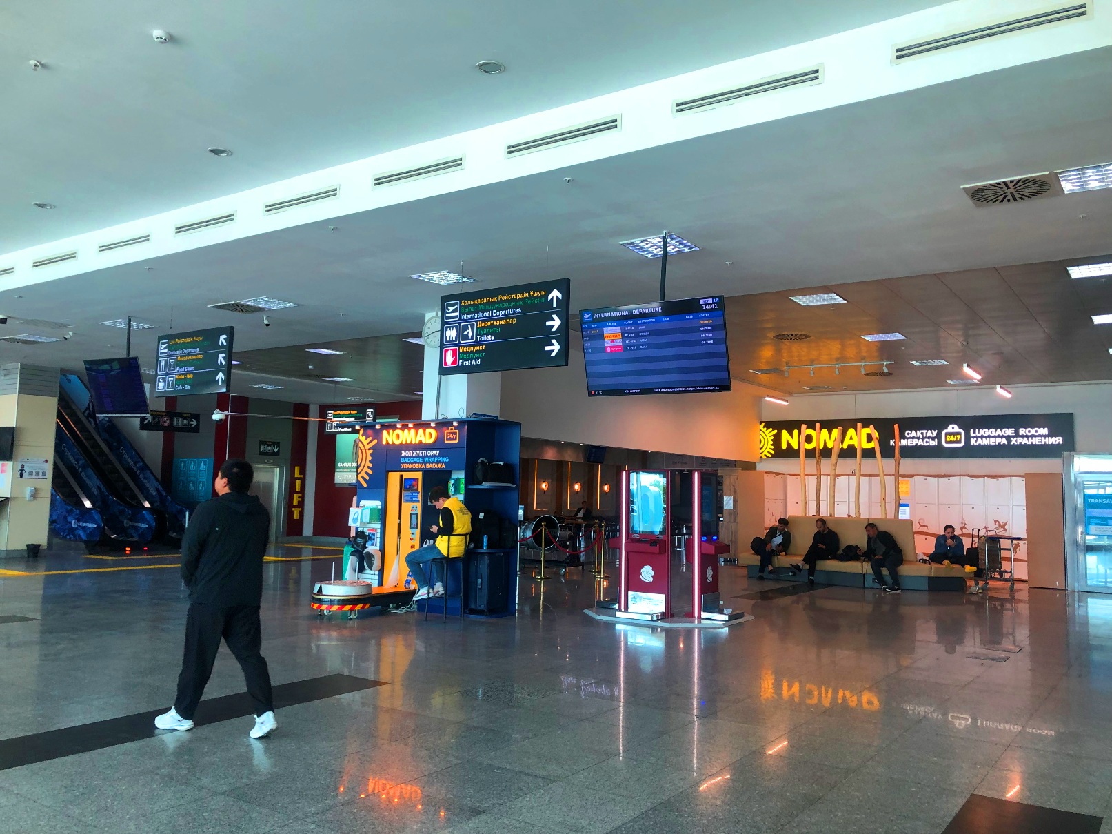 ・私はオンラインチェックインを怠っていた。このLCCはオンラインチェックインを推奨している。かえって、カウンターでチェックイン手続きをすると高い追加料金が取られる。LCCはこういうことがあるので、注意書きをよく読んでおかないといけない。カウンターで最初、オンラインチェックインしないと1万8000テンゲ(約5000円)払わなければならない、と言われた。しかし、この空港にはネットアクセスがないなど弁解すると、高齢者だったためか、カウンター係員が代わってやってくれた。追加料金なしで済んだ。ありがとう。
