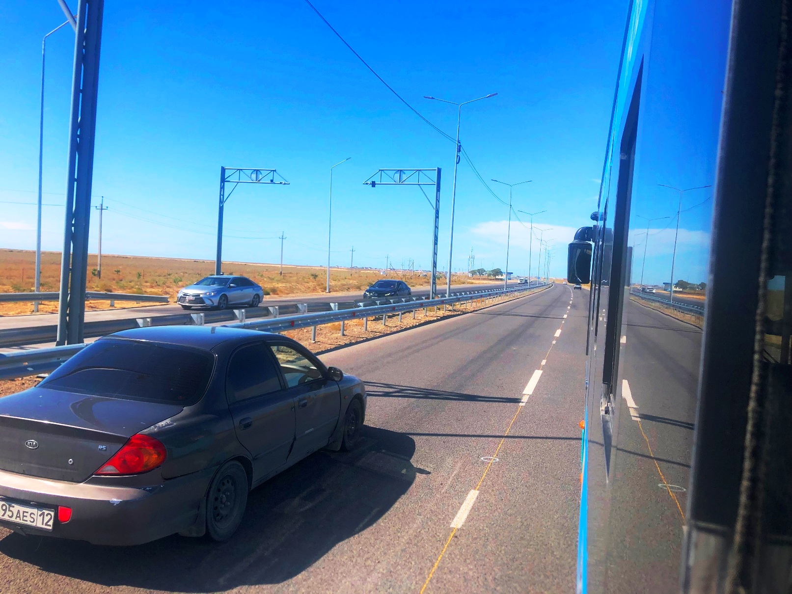 6番バスの正式な料金や時刻表を調べようとしたが、なぜかウェブページにはこのバスだけ載ってない。他のウェブ情報で3番のバスが空港近くに行くともされているが、これは古いと思われる。今年初めごろに工事のため6番バスは空港までは行かなくなったという情報もあったが、もう工事は終わったのだろう、2025年9月現在、ちゃんと空港国際ターミナル玄関口前まで行っている(乗るときもそこから)。料金はアプリなどで払う乗客がほとどんどだが、私は100テンゲ硬貨を出していた。なぜか運転手がそれを突き返すこともあった(つまりただになった)。中央アジアのどこでもそうだが、バス代支払いは適当な感じがする。乗るとき払ったり(アプリ操作も)、降りるとき払ったり、乗ってる途中で払ったりと様々。ここでは私は一応降りる時に払っていた。アプリ操作をした客も、降りる際にそのスマホ画面を運転手に見せていた。バス料金は、2025年2月段階で70テンゲ(19円)という情報があったが、少なくとも空港までは100テンゲだった。空港に着いて70テンゲ分の硬貨を見せると、運転手は「違う」と言って100テンゲ硬貨を取った。市バス全体が100テンゲに値上げしたのか、空港までだけは100テンゲになのかは未確認。タクシーを使うと、地元民でも3000テンゲは取られるし、8000テンゲ~1万テンゲにぼられることもあるという。